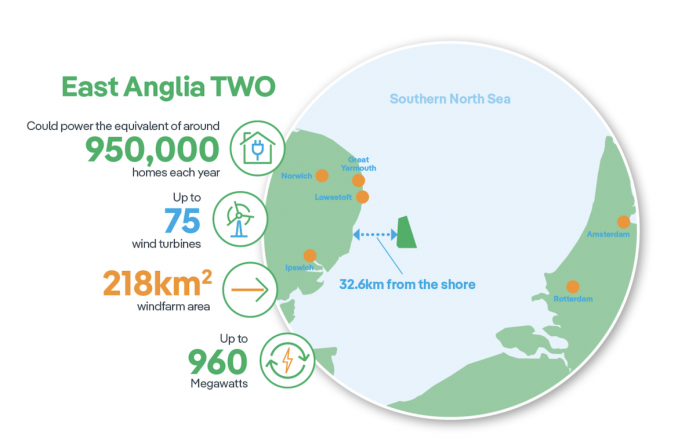 Situated 33 kilometers off the Suffolk coast, East Anglia TWO’s 64 turbines will have the capacity to generate up to 960 megawatts of green electricity – enough to power the equivalent of almost one million homes. Offshore construction is expected to get underway in 2027, with the windfarm becoming operational in 2028.
